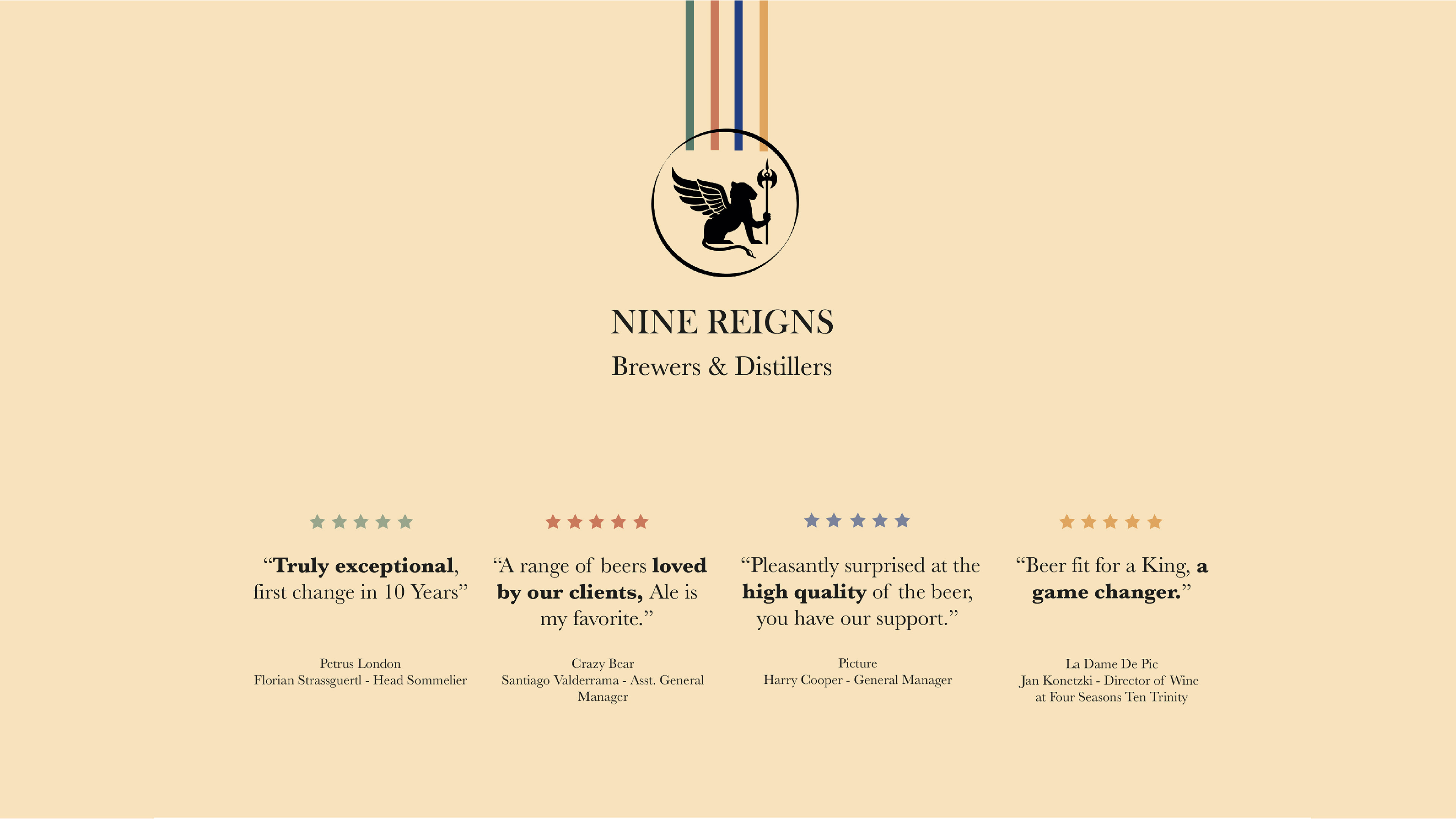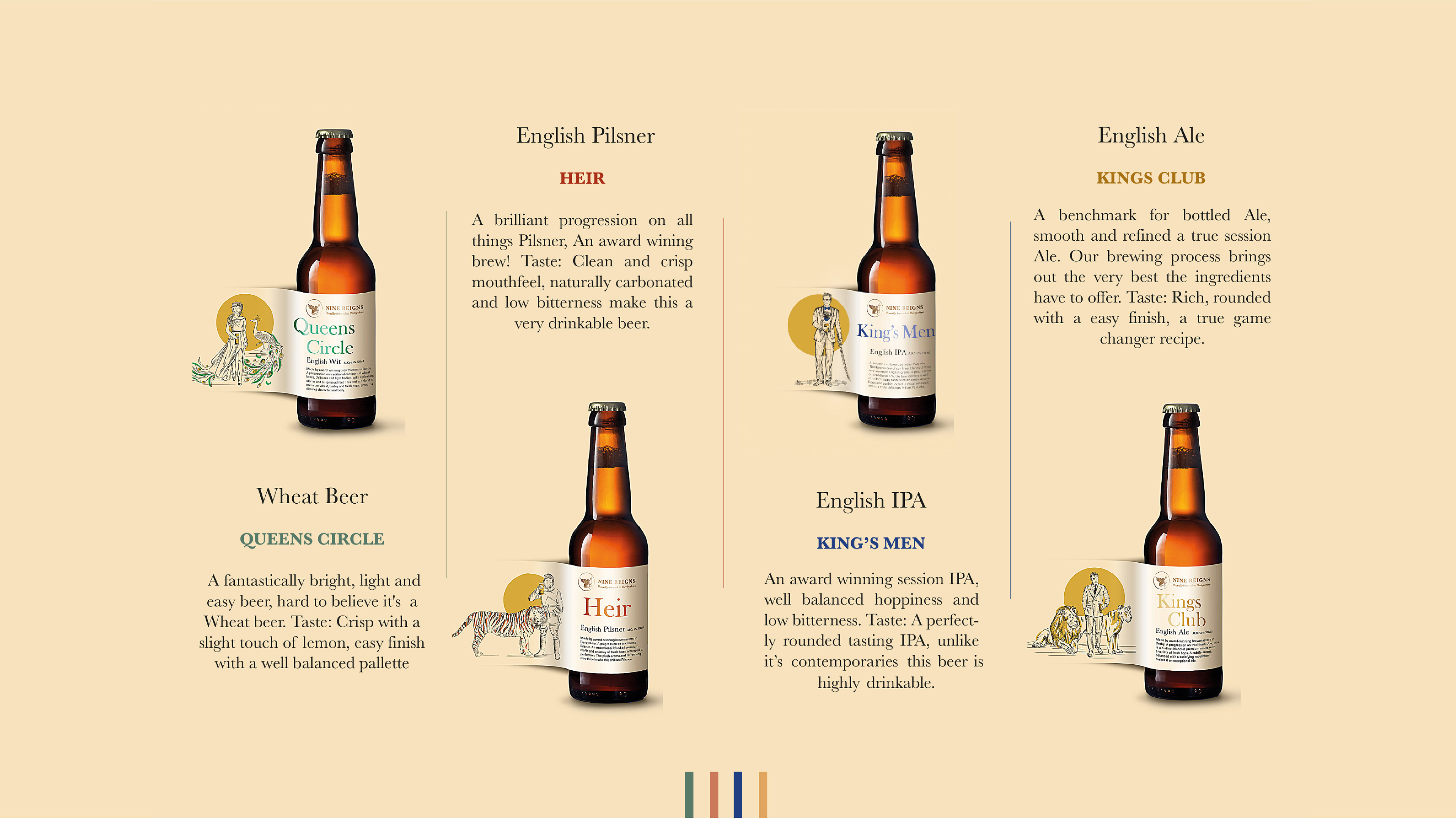 "Nine Reigns is a progressive brewer and distiller of the very finest English Beers & Spirits. We pride ourselves on producing handcrafted beers using only the very best premium produce." - ninereigns.com